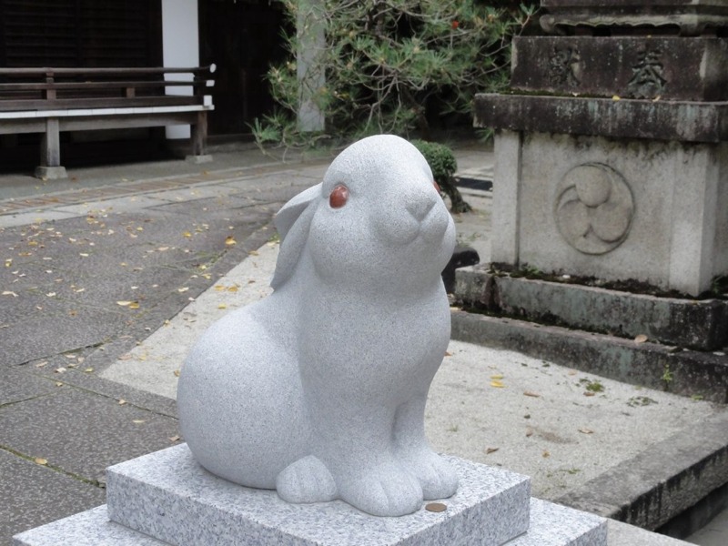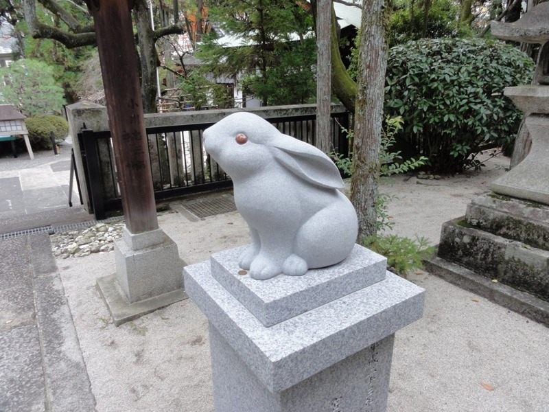 上の写真は岡崎神社のうさぎくんです。この神社は別名、兎神社とも言われ、特に安産の社として知られています。今年の年賀状はネタがなくて、この兎神社の兎たちにたくさん登場してもらいました。ここではそのネタ明かしもしたいと思います。